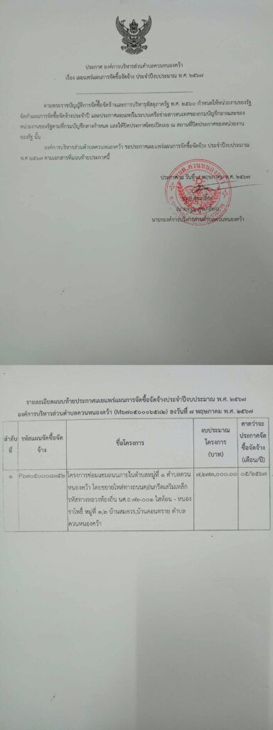 เรื่อง เผยแพร่แผนการจัดซื้อจัดจ้าง ประจำปีงบประมาณ พ.ศ.2567 โครงการการซ่อมแซมถนนภายในตำบลหมู่่ที่ 1 ตำบลควนหนองคว้า โดยขยายไหล่ทางถนนคอนกรีตเสริมเหล็ก ระหัสทางหลวงท้องถิ่น นศ.ถ.72-001 ไสท้อน – หนองราโพธิ์ หมู่ 1,2 บ้านสมควร,บ้านดอนทราย ตำบลควนหนองคว้า